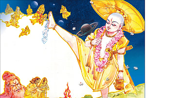 Vamana held the umbrella as though he wanted to mask the might of the asuras and carried staff as if to punish the asuras. His body weight shook the earth. As Vamana approached the banks of Narmada, his radiance blindfolded Shukra and other sages and they wondered who he could be?, is he the Sun or Agni or Sage Sanatkumara?